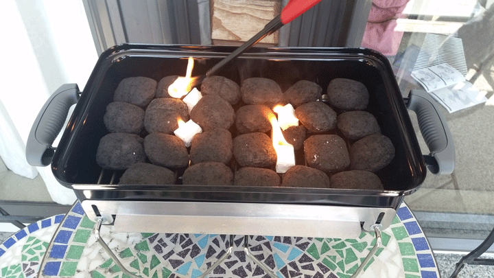 요리가 완료된 후 차콜의 모든 불이 꺼지려면 오랜시간이 필요하니 안전한 장소에 그대로 나뒀다가 모두 불이 꺼진것을 확인 후 위와 같이