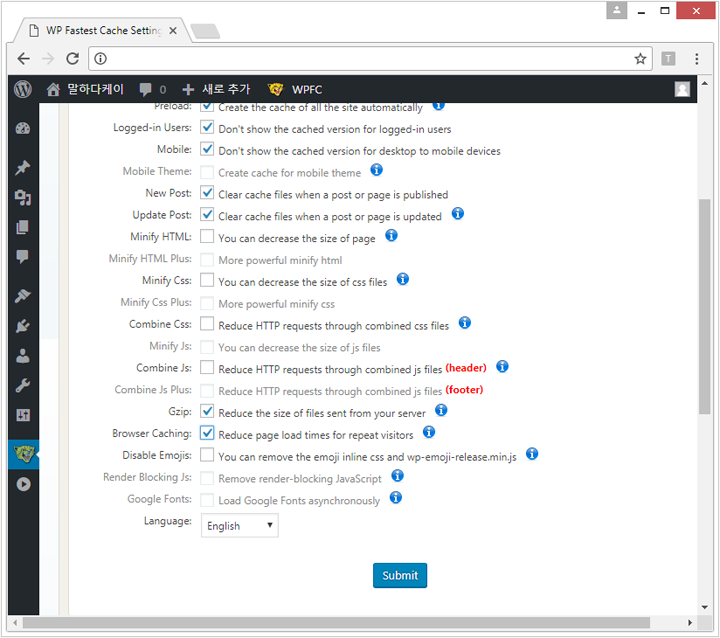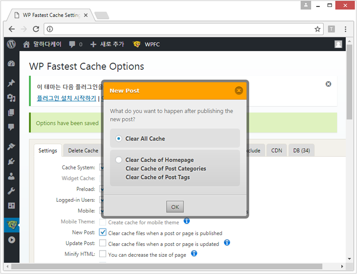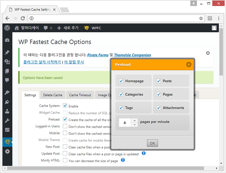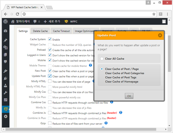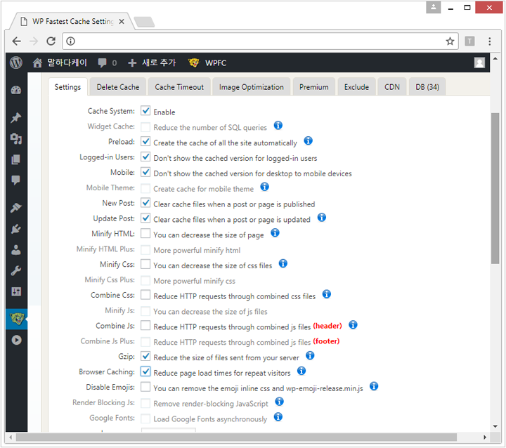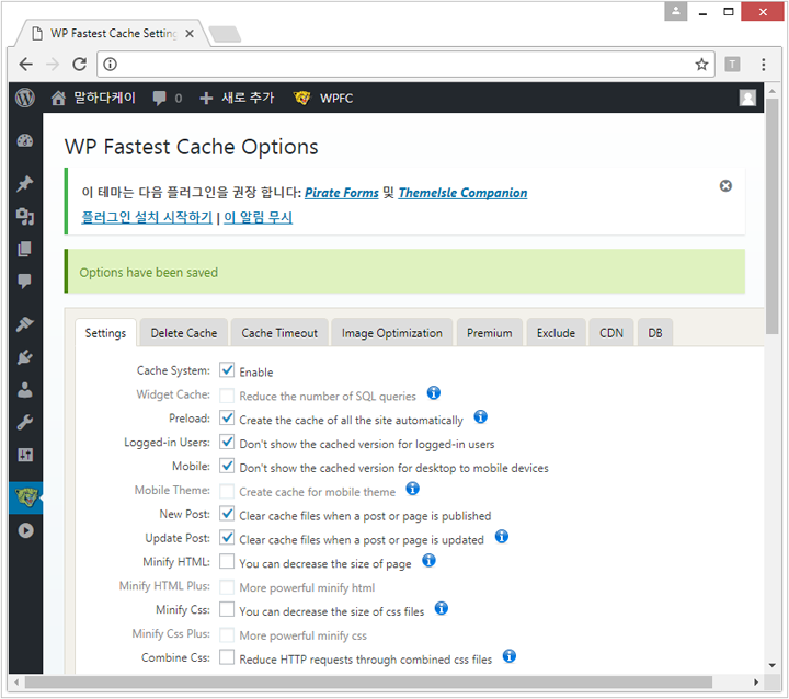 플러그인에서 WP FASTER CACHE 검색후 설치 & 활성화 시켜서